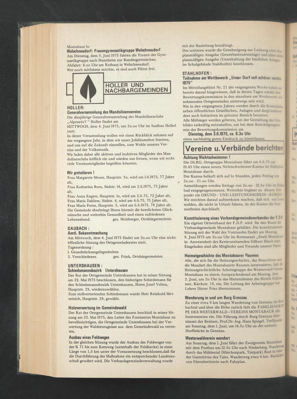 Der Rat der Ortsgemeinde Untershausen hat in seiner Sitzung am 22. Mai 1975 beschlossen, den bisherigen Schiedsmann für den Schiedsmannsbezirk Untershausen, Herrn Josef Velten, Hauptstr. 23, wiederzuwählen.