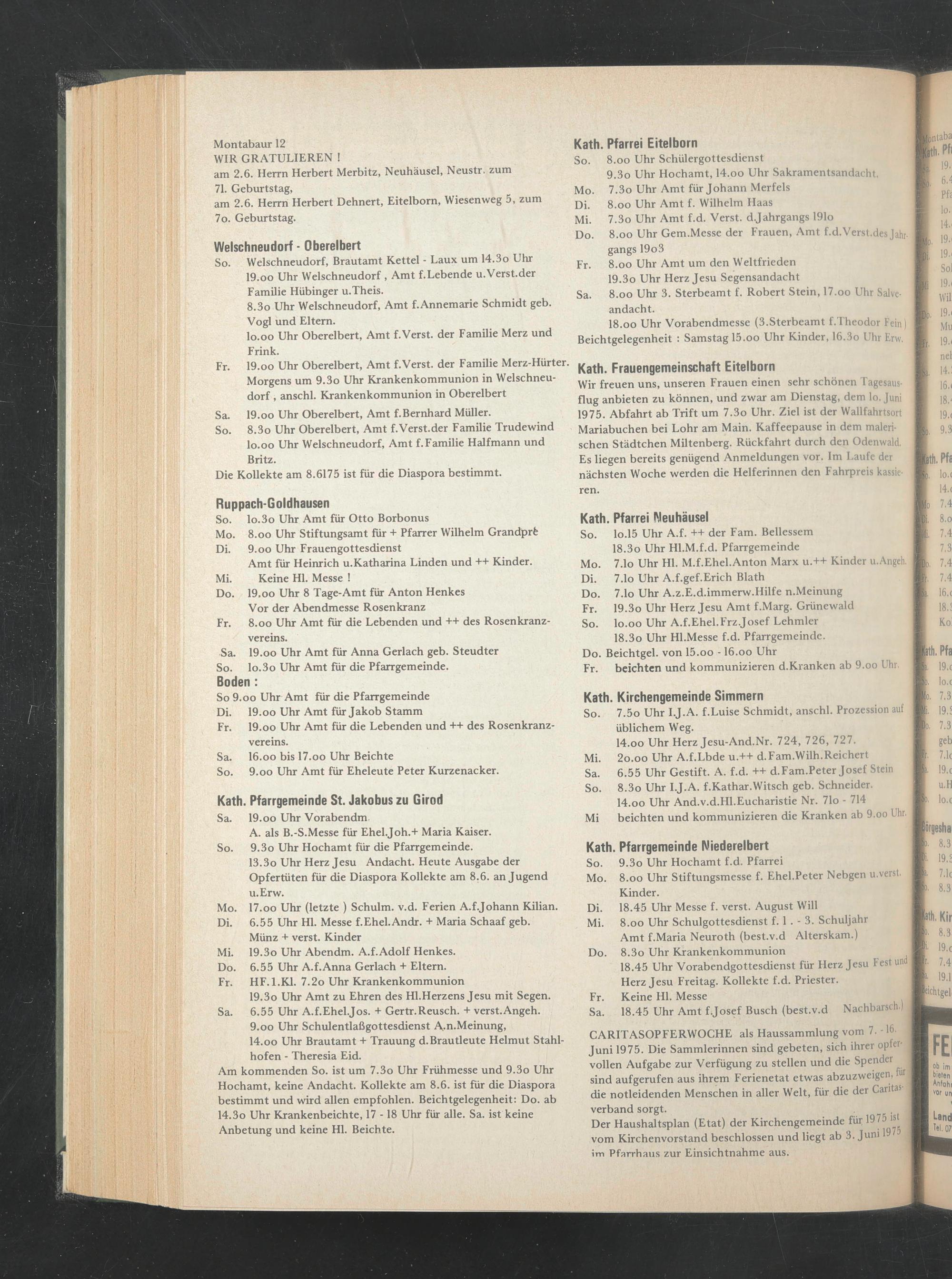 CARITASOPFERWOCHE als Haussammlung vom 7. -16 j Juni 1975. Die Sammlerinnen sind gebeten, sich ihrer opfer- vollen Aufgabe zur Verfügung zu stellen und die Spender sind auf gerufen aus ihrem Ferienetat etwas abzuzweigen, für j die notleidenden Menschen in aller Welt, für die der Caritas- I verband sorgt.
