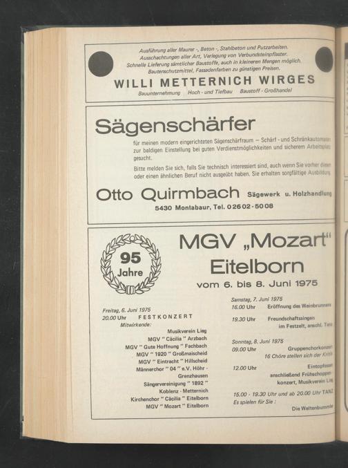 Musikverein Lieg MGV " Cacilia " Arzbach MGV " Gute Hoffnung " Fachbach MGV " 1920 " Großmaischeid MGV " Eintracht " Hillscheid Männerchor " 04 " e.V. Höhr - Grenzhausen Sängervereinigung " 1892 " Koblenz - Metternich Kirchenchor" Cäcilia " Eitelborn MGV " Mozart " Eitelborn