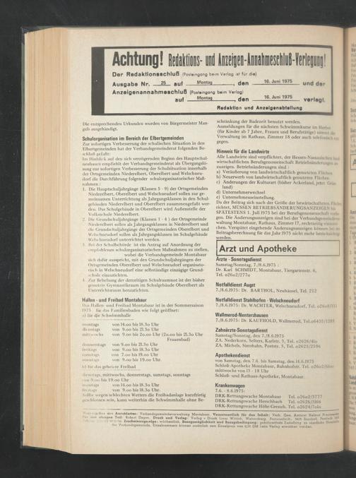 Da der Beitrag sich nach der Größe der bewirtschafteten Flächen richtet, MÜSSEN BETRIEBSÄNDERUNGSANZEIGEN bis SPÄTESTENS 1. Juli 1975 bei der Berufsgenossenschaft vorliegen. Die Änderungsanzeigen sind bei der Verbandsgemeindeverwaltung Montabaur, Rathaus, Zimmer 17, rechtzeitig einzureichen. Verspätet eingehende Änderungsanzeigen können bei der Beitragsberechnung für das Jahr 1975 nicht mehr berücksichtigt werden.
