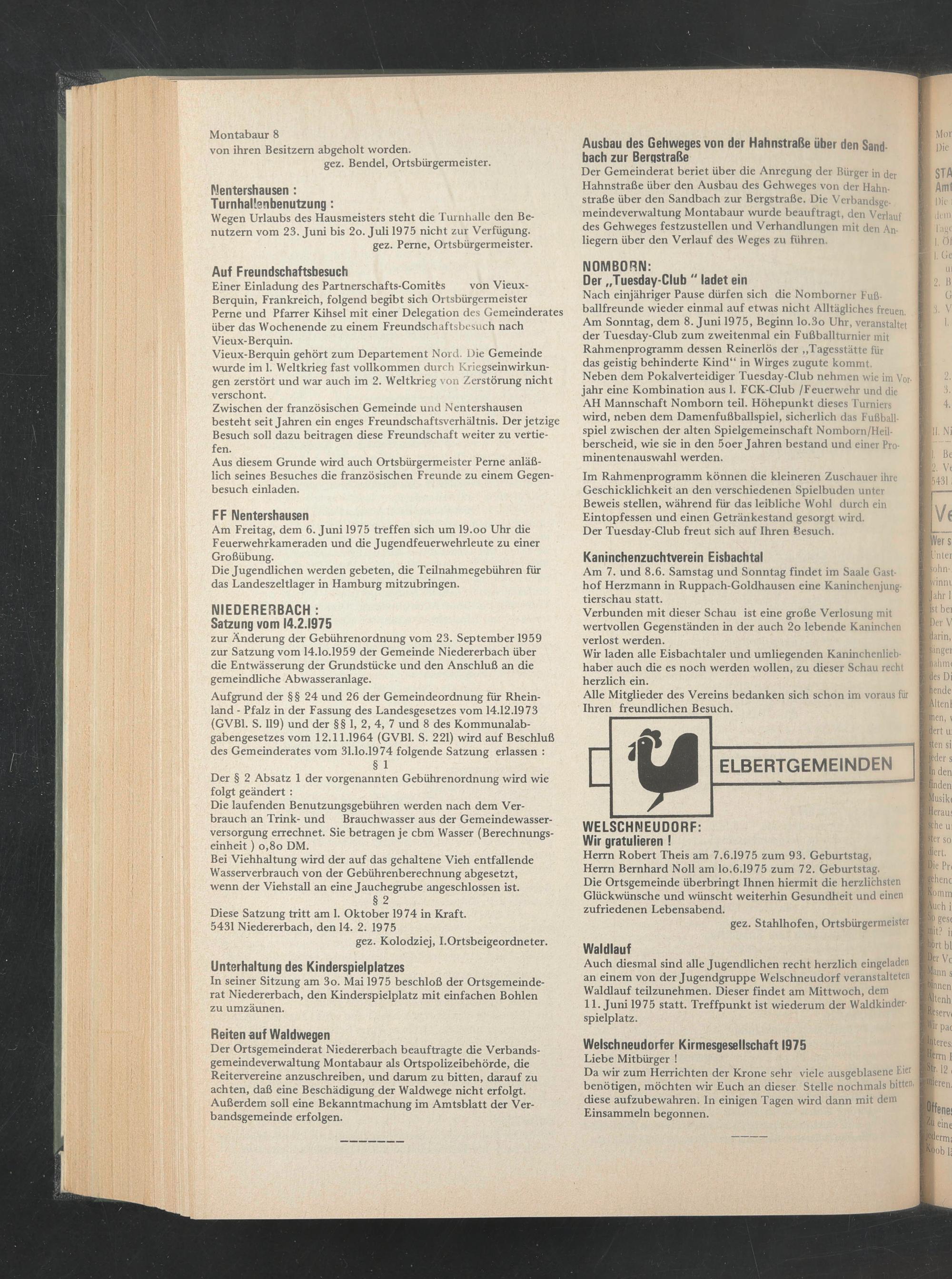 In seiner Sitzung am 3o. Mai 1975 beschloß der Ortsgemeinderat Niedererbach, den Kinderspielplatz mit einfachen Bohlen zu umzäunen.