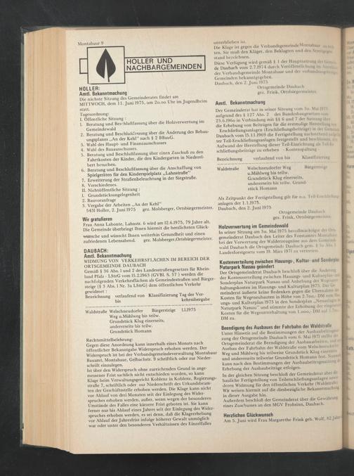 Diese Verfügung wird gemäß § 1 der Hauptsatzung der Gemein de Daubach vom 2.7.1974 durch Veröffentlichung im Amtshl.m der Verbandsgemeinde Montabaur und der verbandsangehörig Gemeinden bekanntgegeben.