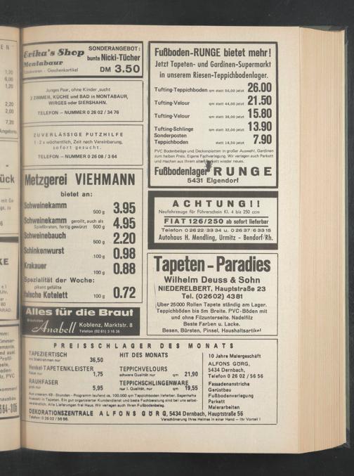Au« unterem 48 - Stunden - Programm laufend ca. 100.000 qm Teppichboden lieferbar. Sagenhafte uiwahi in Tapeten. Ein gut organisierter Kundendienst und beete Fachberatung sind bei uns selbst- veretündlich. Alle Lieferungen frei Haue. Wir verlegen auch Ihren Fußbodenbelag.
