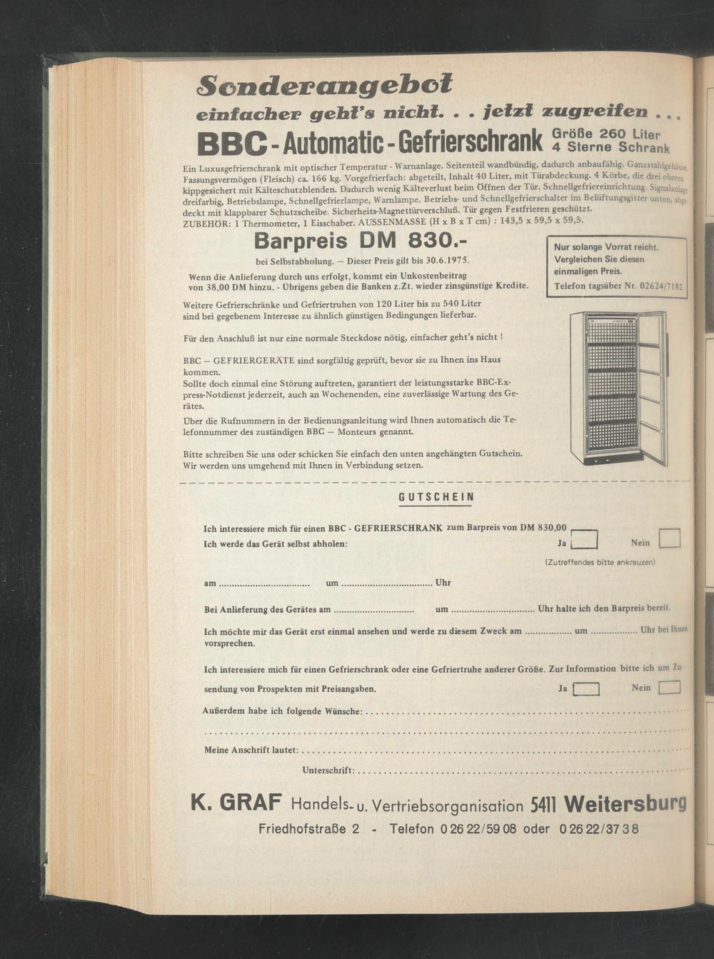 Ich interessiere mich für einen BBC - GEFRIERSCHRANK zum Barpreis von DM 830,0*1 Ich werde das Gerät selbst abholen: