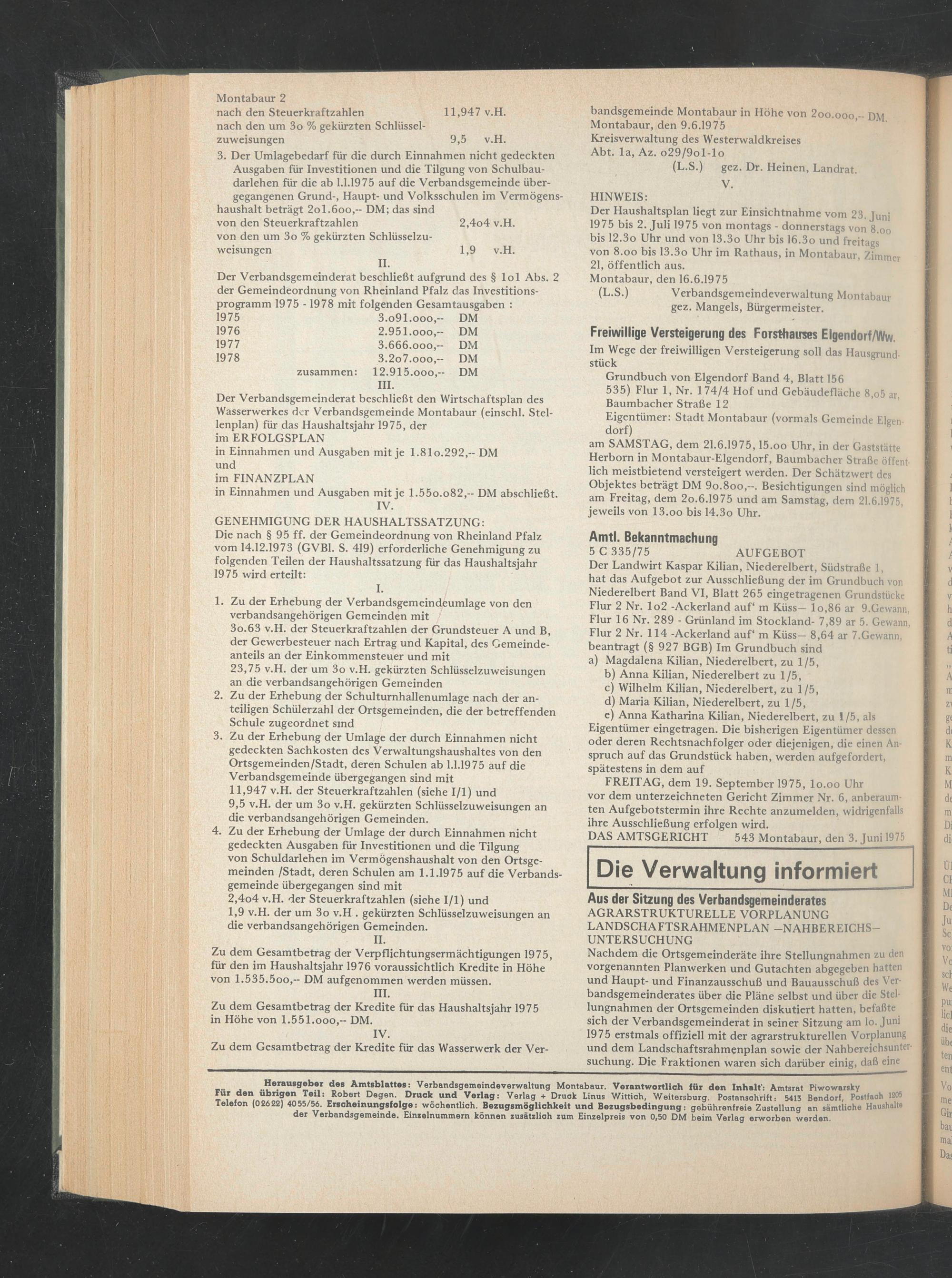 Der Haushaltsplan liegt zur Einsichtnahme vom 23. Juni 1975 bis 2. Juli 1975 von montags - donnerstags von 8.oo bis 12.3o Uhr und von 13.3o Uhr bis 16.3o und freitags von 8.oo bis 13.3o Uhr im Rathaus, in Montabaur, Zimmer 21, öffentlich aus.