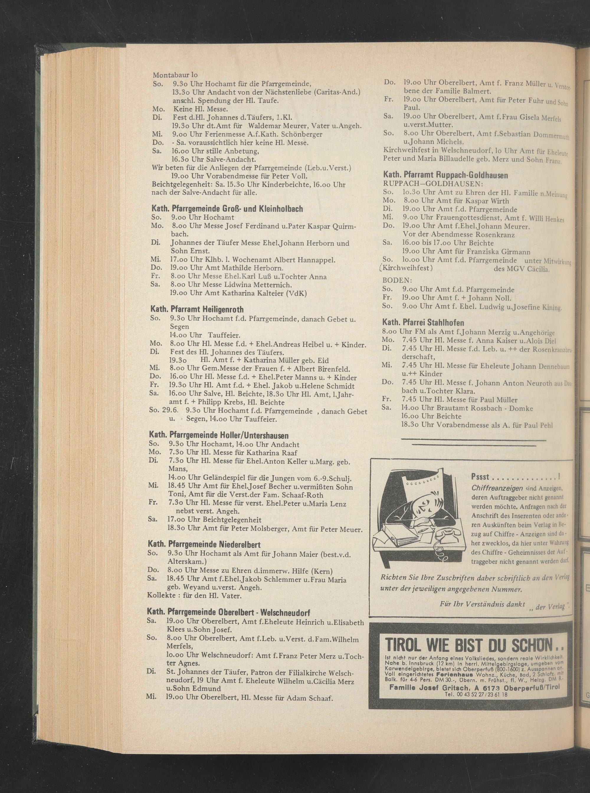 Do. I6.00 Uhr Hl. Messe f.d. + Ehel.Peter Manns u. + Kinder Fr. 19.3o Uhr Hl. Amt f.d. + Ehel. Jakob u.Helene Schmidt Sa. I6.00 Uhr Salve, Hl. Beichte, 18.3o Uhr Hl. Amt, l.Jahr- amt f. + Philipp Krebs, Hl. Beichte So. 29.6. 9.3o Uhr Hochamt f.d. Pfarrgemeinde , danach Gebet u. ' Segen, 14.oo Uhr Tauffeier.