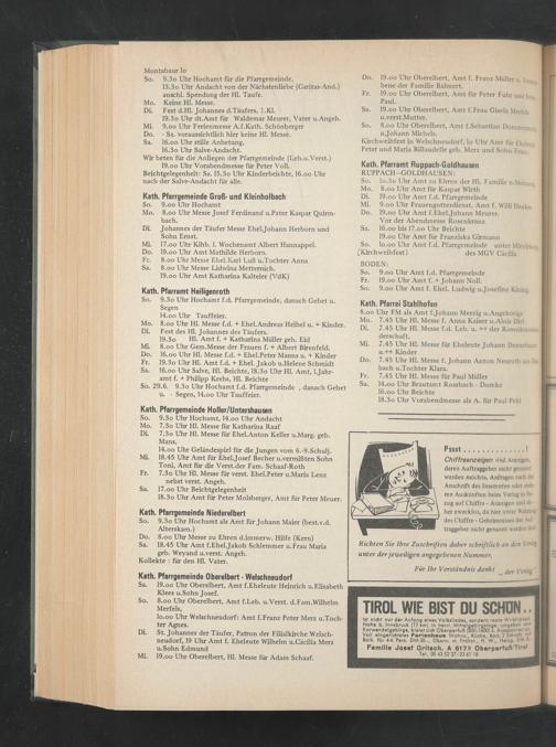 Mi. 18.45 Uhr Amt für Ehel.Josef Becher u.vermißten Sohn Toni, Amt für die Verst.der Farn. Schaaf-Roth Fr. 7.3o Uhr Hl. Messe für verst. Ehel.Peter u.Maria Lenz nebst verst. Angeh.