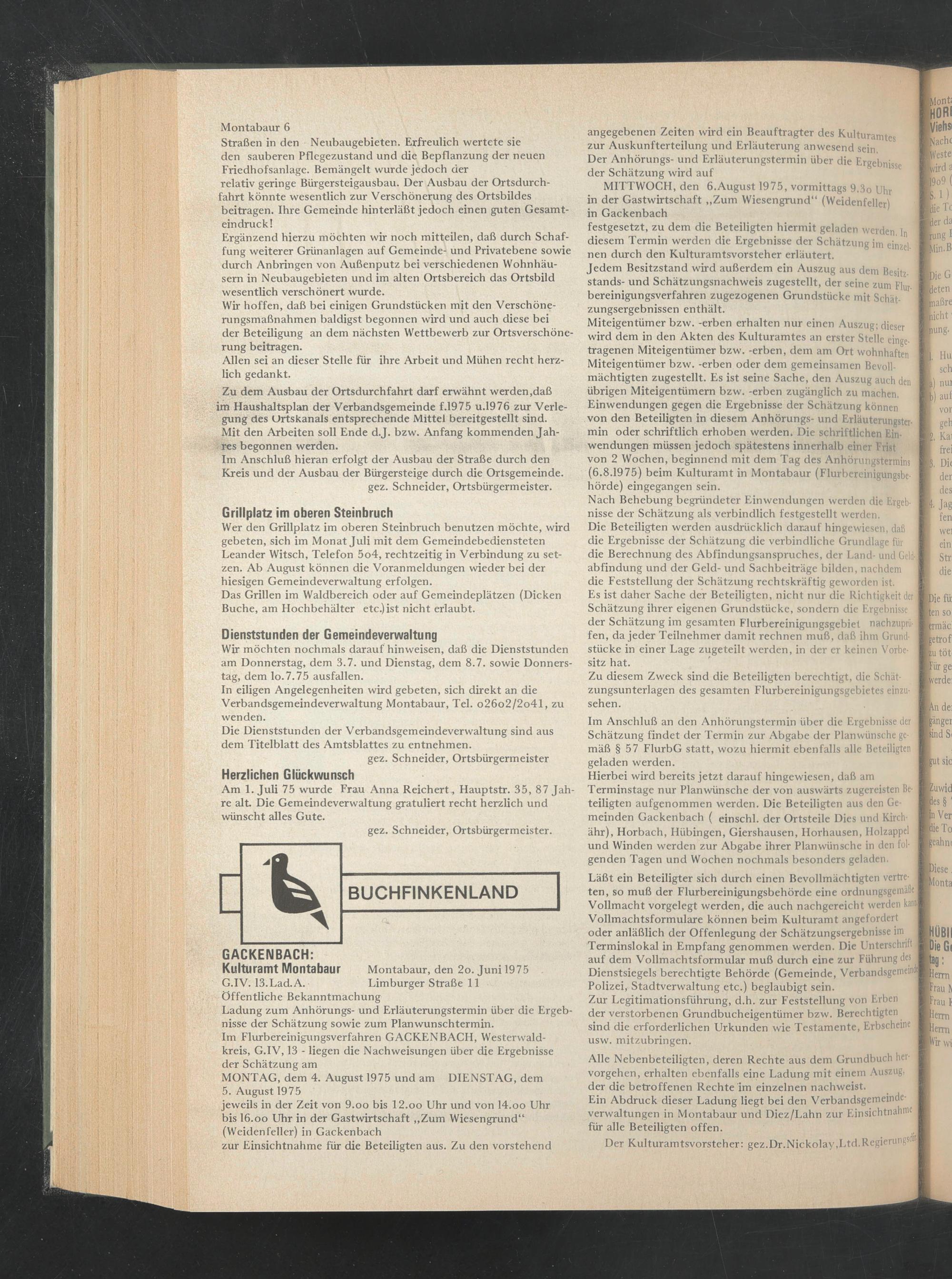 tragenen Miteigentümer bzw. -erben, dem am Ort wohnhaften Miteigentümer bzw. -erben oder dem gemeinsamen Bevollmächtigten zugestellt. Es ist seine Sache, den Auszug auch den übrigen Miteigentümern bzw. -erben zugänglich zu machen. Einwendungen gegen die Ergebnisse der Schätzung können von den Beteiligten in diesem Anhörungs- und Erläuterungstermin oder schriftlich erhoben werden. Die schriftlichen Einwendungen müssen jedoch spätestens innerhalb einer Frist von 2 Wochen, beginnend mit dem Tag des Anhörungstermins (6.8.1975) beim Kulturamt in Montabaur (Flurbereinigungsbehörde) eingegangen sein.