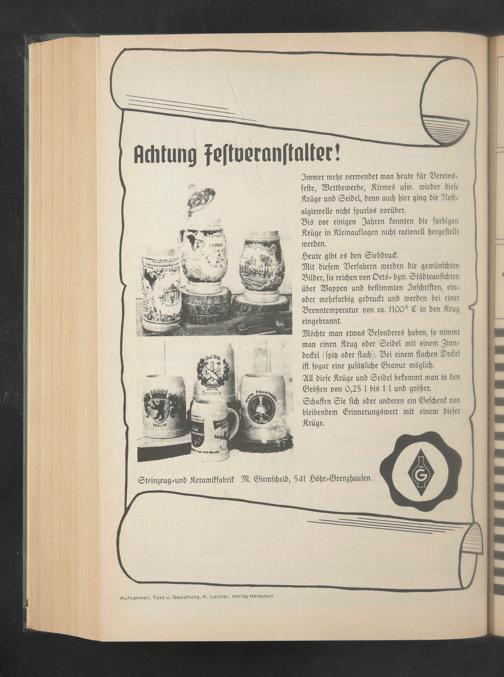 3mmer mehr oerroenbet man beute für BereinS* fcftc, SBettberoerbe, ÄirmeS ufro. roieber biefc Krüge unb Seibel, bcnn auch hier ging bie 97oft* algiemelle nicht fpurloS vorüber.