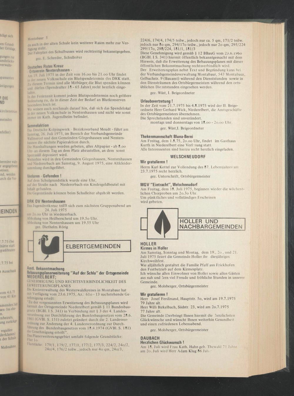 In der Zeit vom 21.7.1975 bis 4.8.1975 wird der II. Beigeordnete Herr Gerhard Wiek, Niederelbert, die Amtsgeschäfte des Ortsbürgermeisters übernehmen.