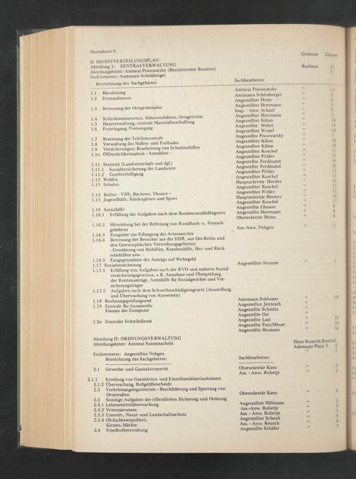 Amtsrat Piwowarsky Amtmann Schönberger Angestellter Hesse Angestellter Herrmann Insp. - Anw. Schaaf Angestellter Herrmann Angestellter Kilian Angestellte Weber Angestellter Wessel Angestellte Piwowarsky Angestellter Kilian Angestellter Kilian Angestellter Koschel Angestellter Pöhler Angestellte Ferdinand Angestellte Ferdinand Angestellter Pöhler Angestellter Koschel Hauptsekretär Henkes Angestellter Koschel Angestellter Pöhler Hauptsekretär Henkes Angestellter Koschel Angestellte Glasner Angestellte Herrmann Obersekretär Heinz