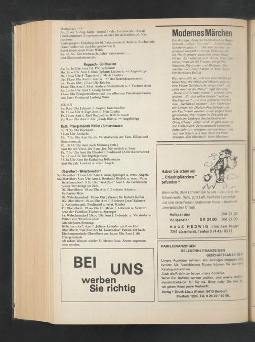 Sa.Oberelbert 19.oo Uhr Amt f„ Anna Sprenger u. verst. Angeh. So.Oberelbert 8 .oo Uhr Amt f. Berthold Merfels u. verst. Vater Welschneudorf: 9.3o Uhr “Waldfest“ Amt f. die Gefallenen beider Weltkriege im Zelt.