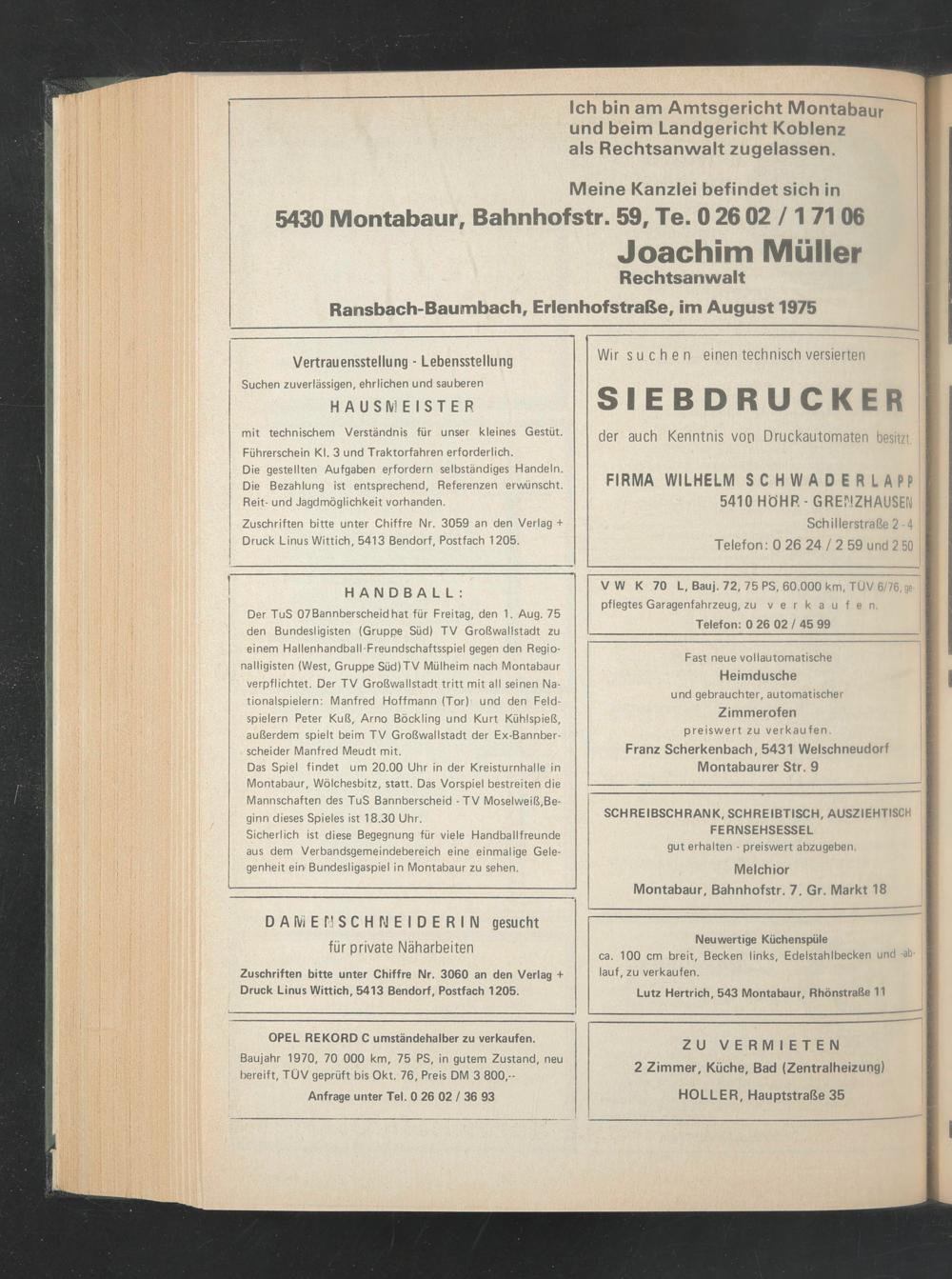 Der TuS 07 Bannberscheid hat für Freitag, den 1. Aug. 75 den Bundesligisten (Gruppe Süd) TV Großwallstadt zu einem Hallenhandball-Freundschaftsspiel gegen den Regionalligisten (West, Gruppe Süd)TV Mülheim nach Montabaur verpflichtet. Der TV Großwallstadt tritt mit all seinen Nationalspielern: Manfred Hoffmann (Tor) und den Feldspielern Peter Kuß, Arno Böckling und Kurt Kühlspieß, außerdem spielt beim TV Großwallstadt der Ex-Bannber- scheider Manfred Meudt mit.