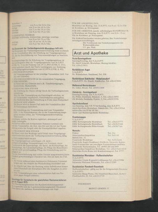 Samstag/Sonntag, den 9./lo.8.1975 Dr. Polier, Dernbach, Rheinstr. 5, Tel. o26o2/3893 ZA Michels, Siershahn, Poststr. 3, Tel. o2623/2596