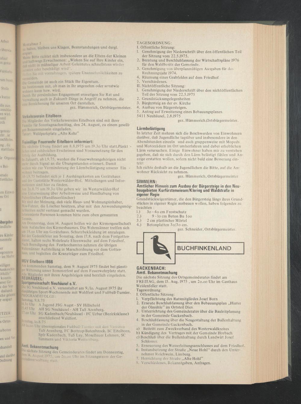 , le nächste Sitzung des Gemeinderates findet am Donnerstag, am 14. August 1975, um 2o.oo Uhr im Sitzungsraum der Gemeindeverwaltung statt.