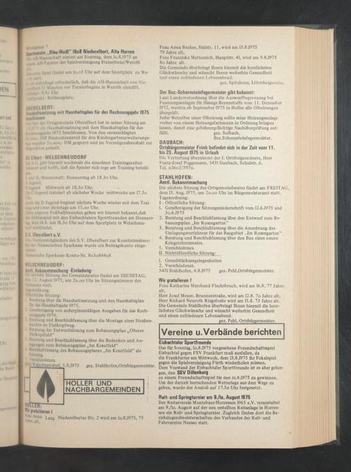 Die nächste Sitzung des Ortsgemeinderates findet am FREITAG, dem 15. Aug. 1975, um 2o.oo Uhr im Bürgermeisteramt statt. Tagesordnung: