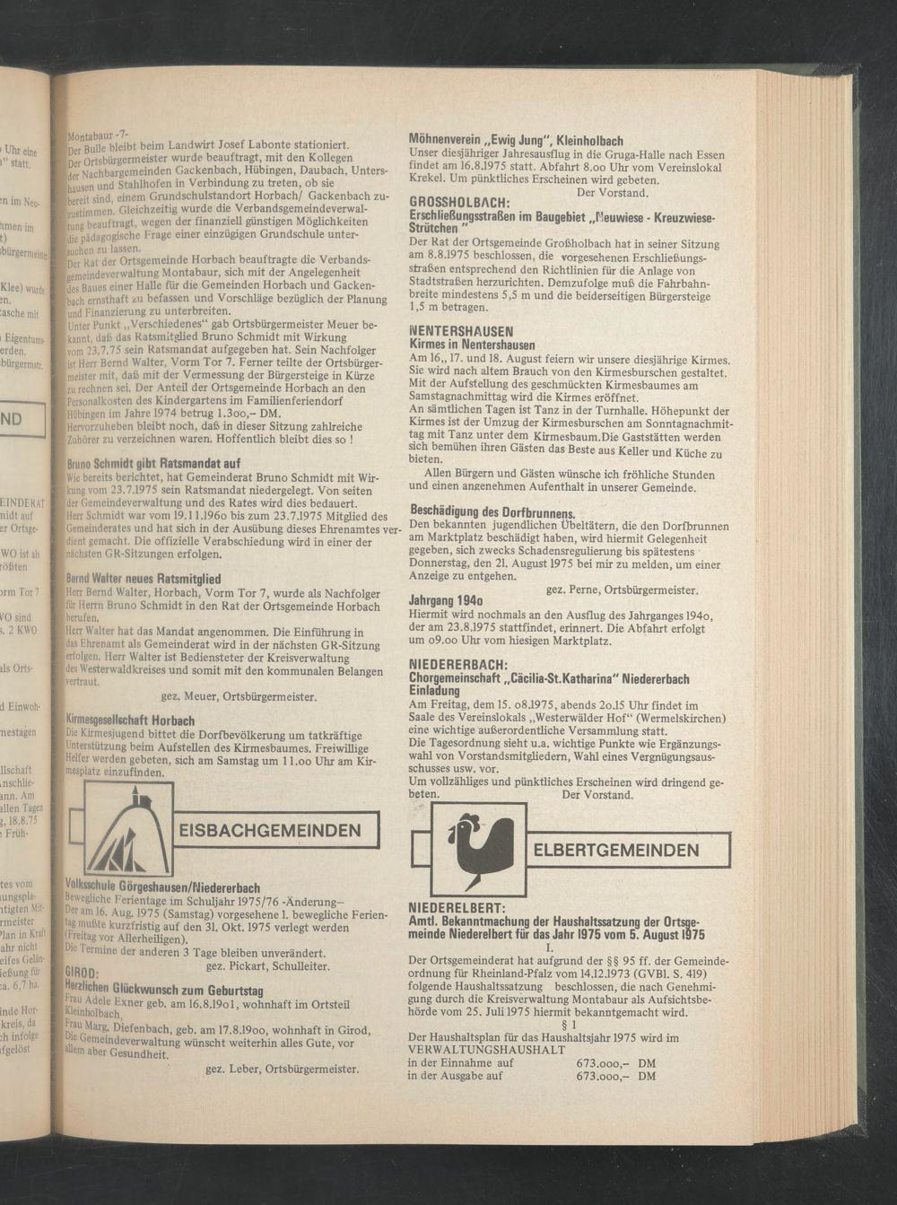 Unter Punkt „Verschiedenes“ gab Ortsbürgermeister Meuer bekannt, daß das Ratsmitglied Bruno Schmidt mit Wirkung vom 23.7.75 sein Ratsmandat aufgegeben hat. Sein Nachfolger ist Herr Bernd Walter, Vorm Tor 7. Ferner teilte der Ortsbürgermeister mit, daß mit der Vermessung der Bürgersteige in Kürze zu rechnen sei. Der Anteil der Ortsgemeinde Horbach an den Personalkosten des Kindergartens im Familienferiendorf Hübingen im Jahre 1974 betrug 1.3oo,- DM.