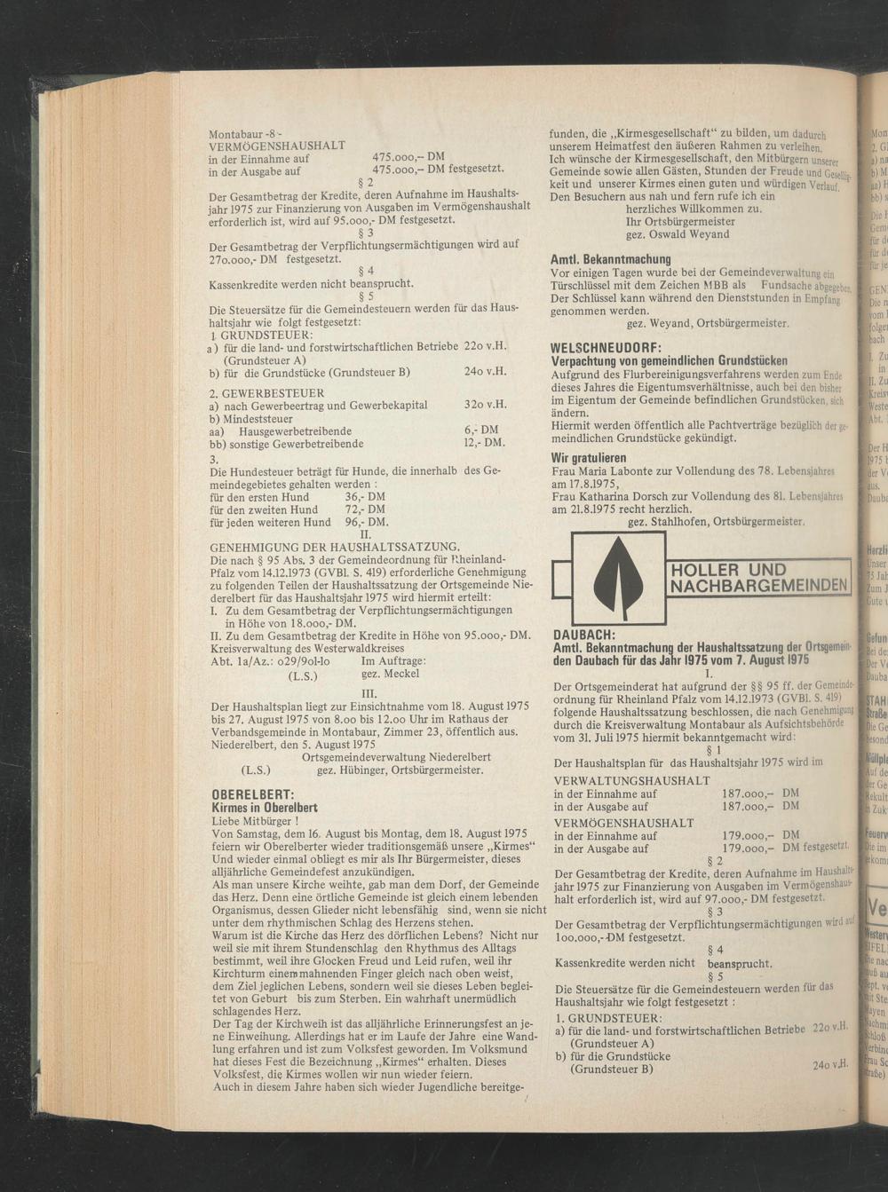 Der Ortsgemeinderat hat aufgrund der § § 95 ff. der Gemeindeordnung für Rheinland Pfalz vom 14.12.1973 (GVB1. S. 419) folgende Haushaltssatzung beschlossen, die nach Genehmigung durch die Kreisverwaltung Montabaur als Aufsichtsbehörde vom 31. Juli 1975 hiermit bekanntgemacht wird:
