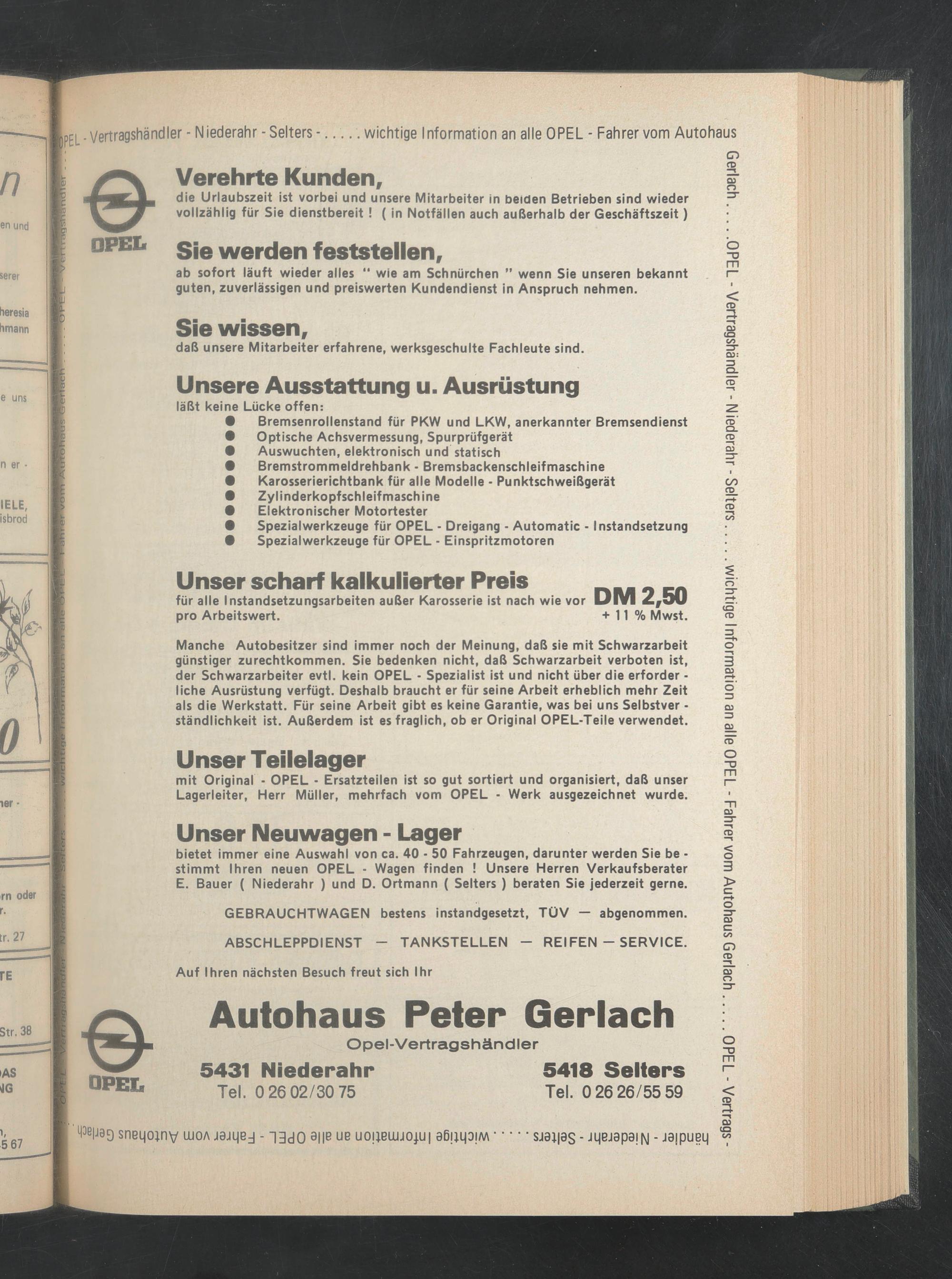 bietet immer eine Auswahl von ca. 40 - 50 Fahrzeugen, darunter werden Sie be • stimmt Ihren neuen OPEL - Wagen finden ! Unsere Herren Verkaufsberater E. Bauer ( Niederahr ) und D. Ortmann ( Selters ) beraten Sie jederzeit gerne.