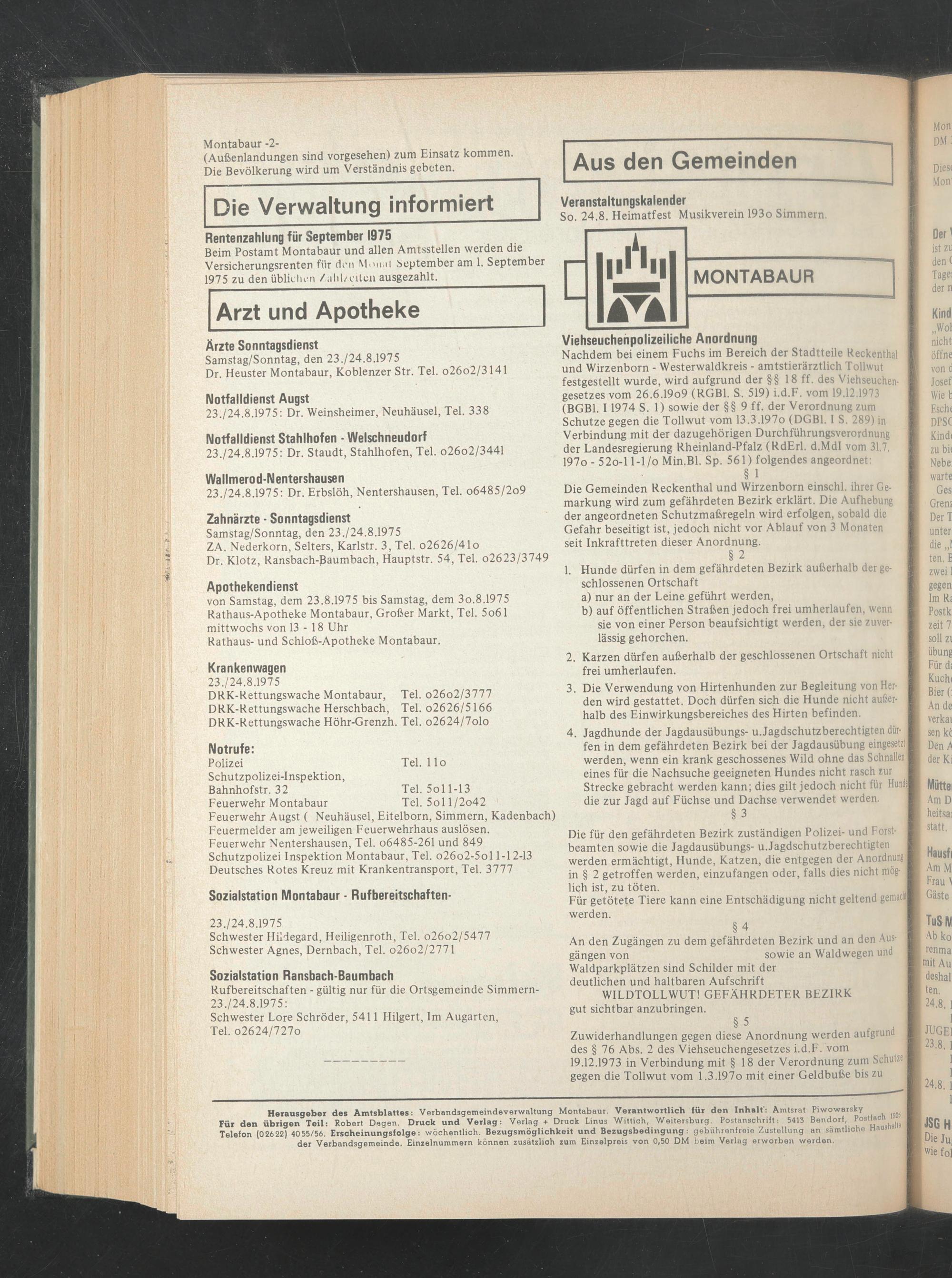 Herausgeber des Amtsblattes: Verbandsgemeindeverwaltung Montabaur. Verantwortlich für den Inhalt': Amtsrat Piwowarsky Für den übrigen Teil: Robert Degen. Druck und Verlag: Verlag + Druck Linus Wittich, Weitersburg. Postanschrift; 5413 Bendorf, Postfach 12^ Telefon (02622) 4055/56. Erscheinungsfolge: wöchentlich. Bezugsmöglichkeit und Bezugsbedingung: gebührenfreie Zustellung an sämtliche Haushalte der Verbandsgemeinde. Einzelnummern können zusätzlich zum Einzelpreis von 0,50 DM beim Verlag erworben werden.