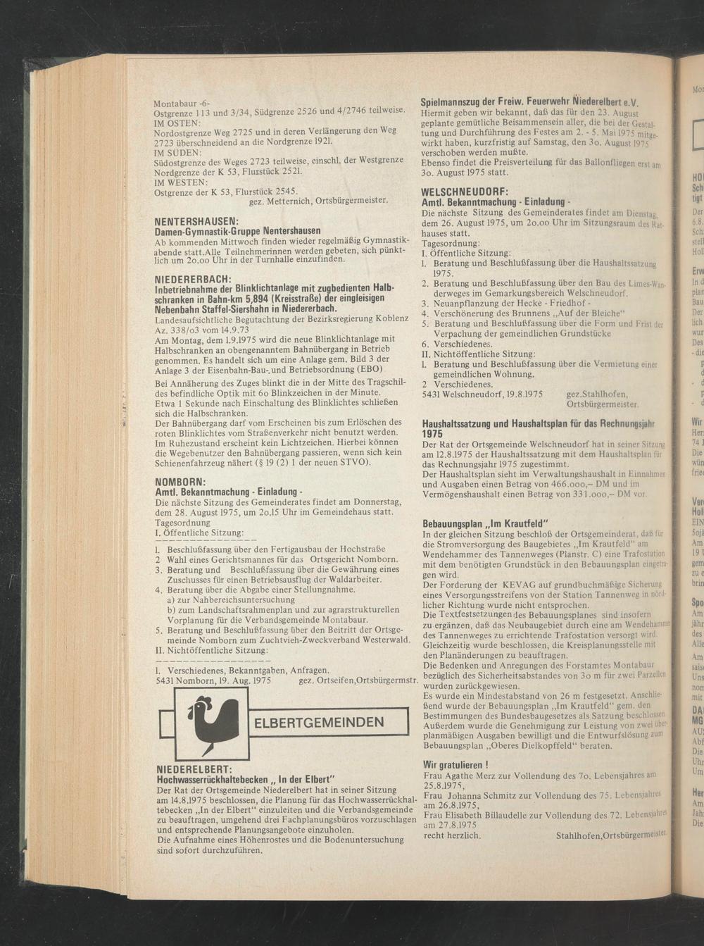 Der Rat der Ortsgemeinde Welschneudorf hat in seiner Sitzung am 12.8.1975 der Haushaltssatzung mit dem Haushaltsplan für das Rechnungsjahr 1975 zugestimmt.
