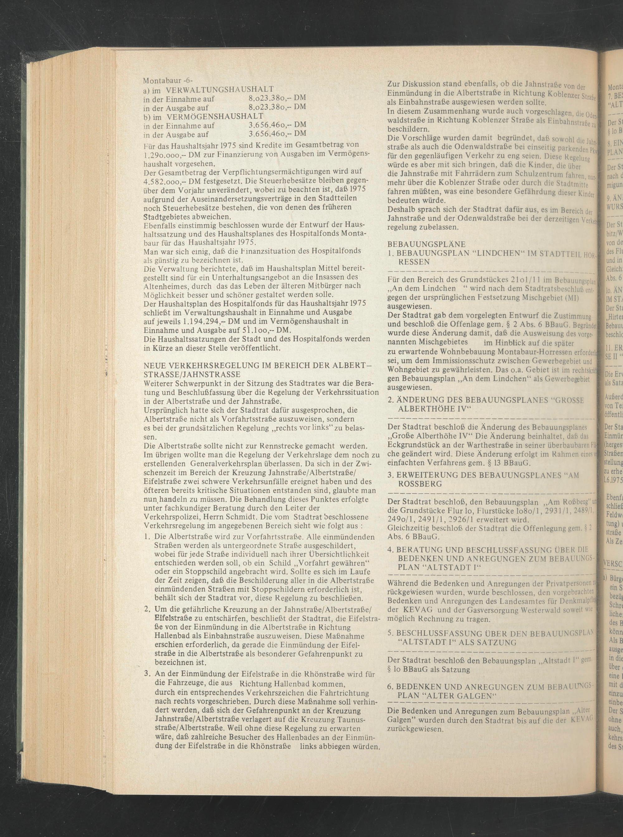 Ebenfalls einstimmig beschlossen wurde der Entwurf der Haushaltssatzung und des Haushaltsplanes des Hospitalfonds Montabaur für das Haushaltsjahr 1975.