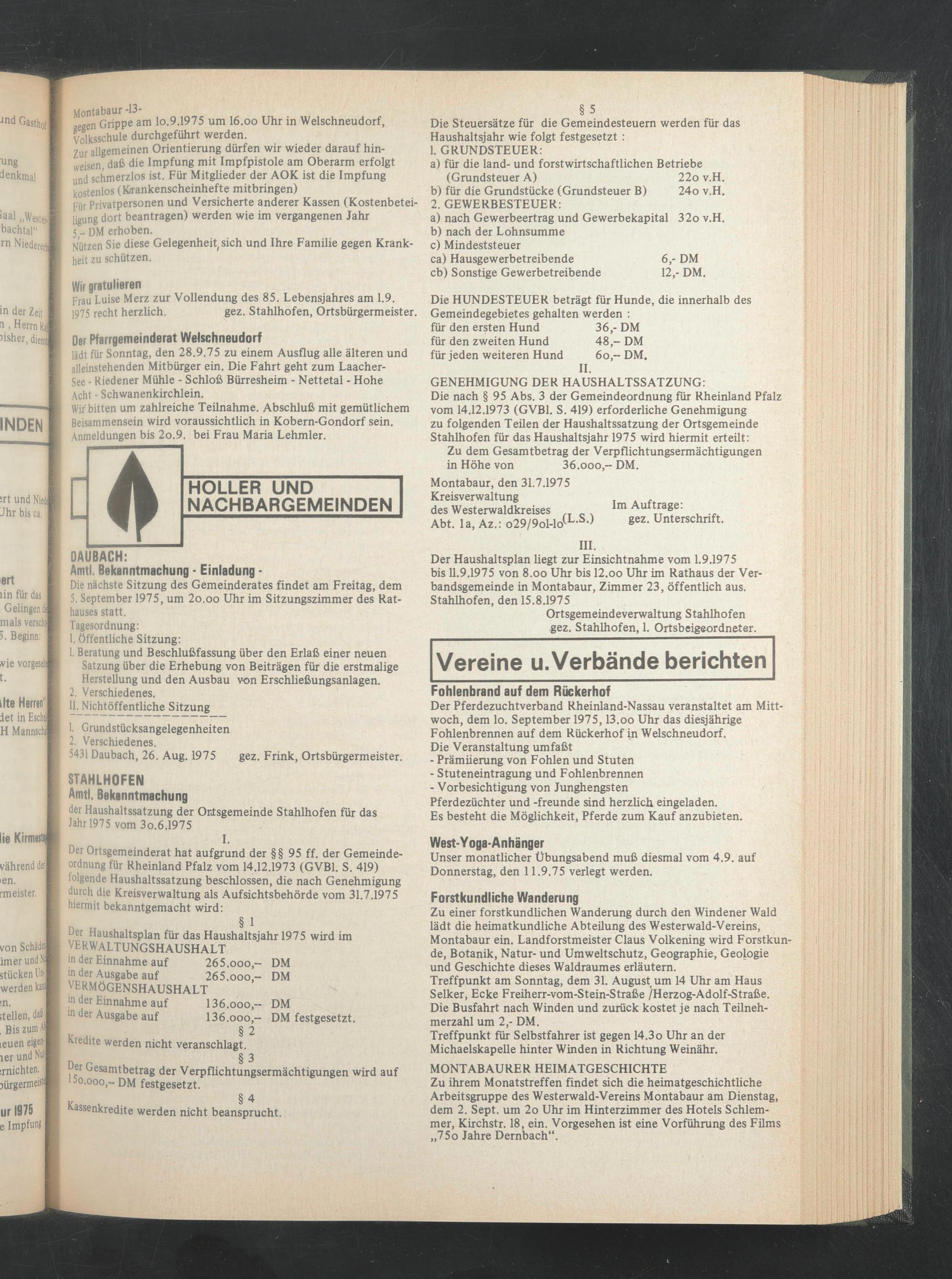 Der Haushaltsplan liegt zur Einsichtnahme vom 1.9.1975 bis 11.9.1975 von 8 .oo Uhr bis 12.oo Uhr im Rathaus der Verbandsgemeinde in Montabaur, Zimmer 23, öffentlich aus. Stahlhofen, den 15.8.1975