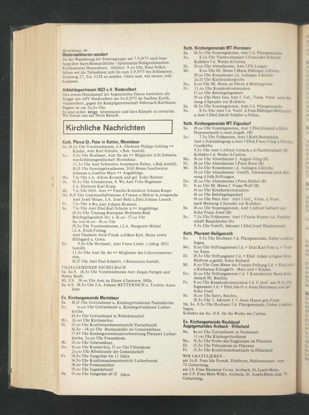 Mi. 3.9. 19.oo Uhr Amt zu Ehren d.Immerw. Hilfe Sa. 6.9. 18.3o Uhr J.A. Johann METTERNICH u. Tochter Anneliese.