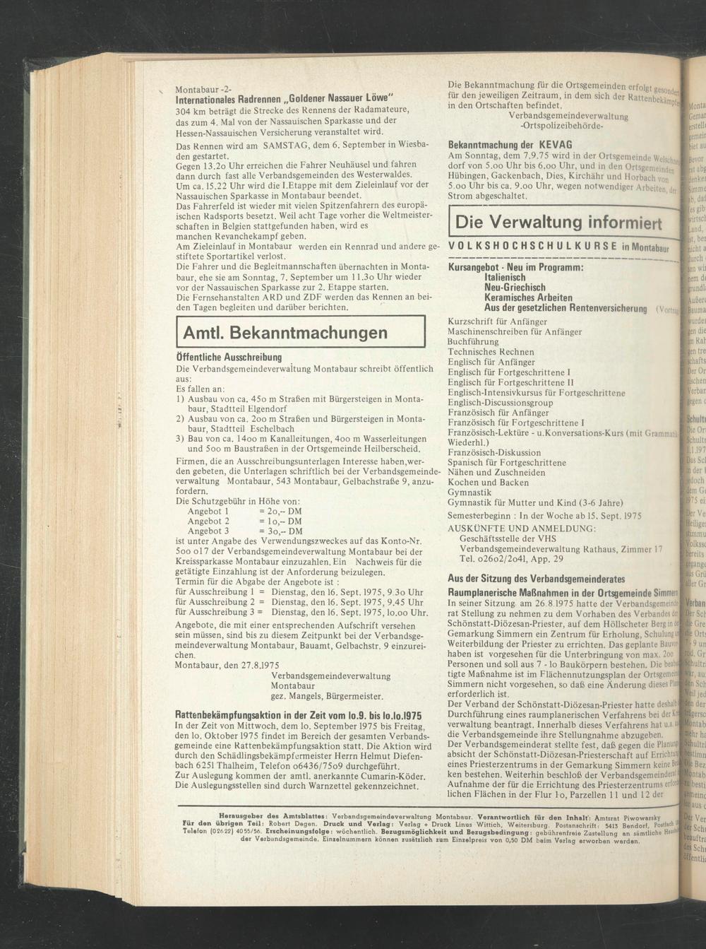 In der Zeit von Mittwoch, dem lo. September 1975 bis Freitag, den lo. Oktober 1975 findet im Bereich der gesamten Verbandsgemeinde eine Rattenbekämpfungsaktion statt. Die Aktion wird durch den Schädlingsbekämpfermeister Herrn Helmut Diefenbach 6251 Thalheim, Telefon o6436/75o9 durchgeführt.