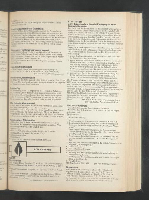 Die nächste Sitzung des Gemeinderates findet am FREITAG, dem 5 September 1975, um 2o oo Uhr im Bürgermeisteramt statt.