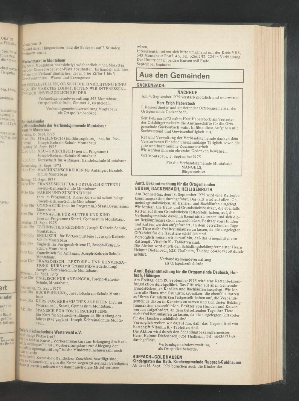 Am Freitag, dem 19. September 1975 wird eine Rattenbekämpfungsaktion durchgeführt. Das Gift wird auf allen Gemeindegrundstücken, an Kanälen und Bachläufen ausgelegt. Wir fordern alle Haus- und Grundstücksbesitzer, die ebenfalls Ratten auf ihren Grundstücken festgestellt haben auf, die Verbandsgemeinde davon in Kenntnis zu setzen und sich dieser Bekämpfungsaktion anzuschließen. Besitzer von Hunden und Katzen werden aufgefordert, an dem betreffenden Tage ihre Tiere nicht frei herumlaufen zu lassen, da die ausgelegten Giftköder für die Haustiere schädlich sind.