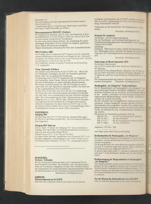 am 6.9.1975 Frau Helene Becher, Hauptstr. 4o, 85 Jahre alt, am 23.9.1975 wird Herr Gottfried Schneider, Hauptstr, 75, 76 Jahre alt und Frau Anna Weisbrod, Schloßstraße 16,75 Jali- re alt.