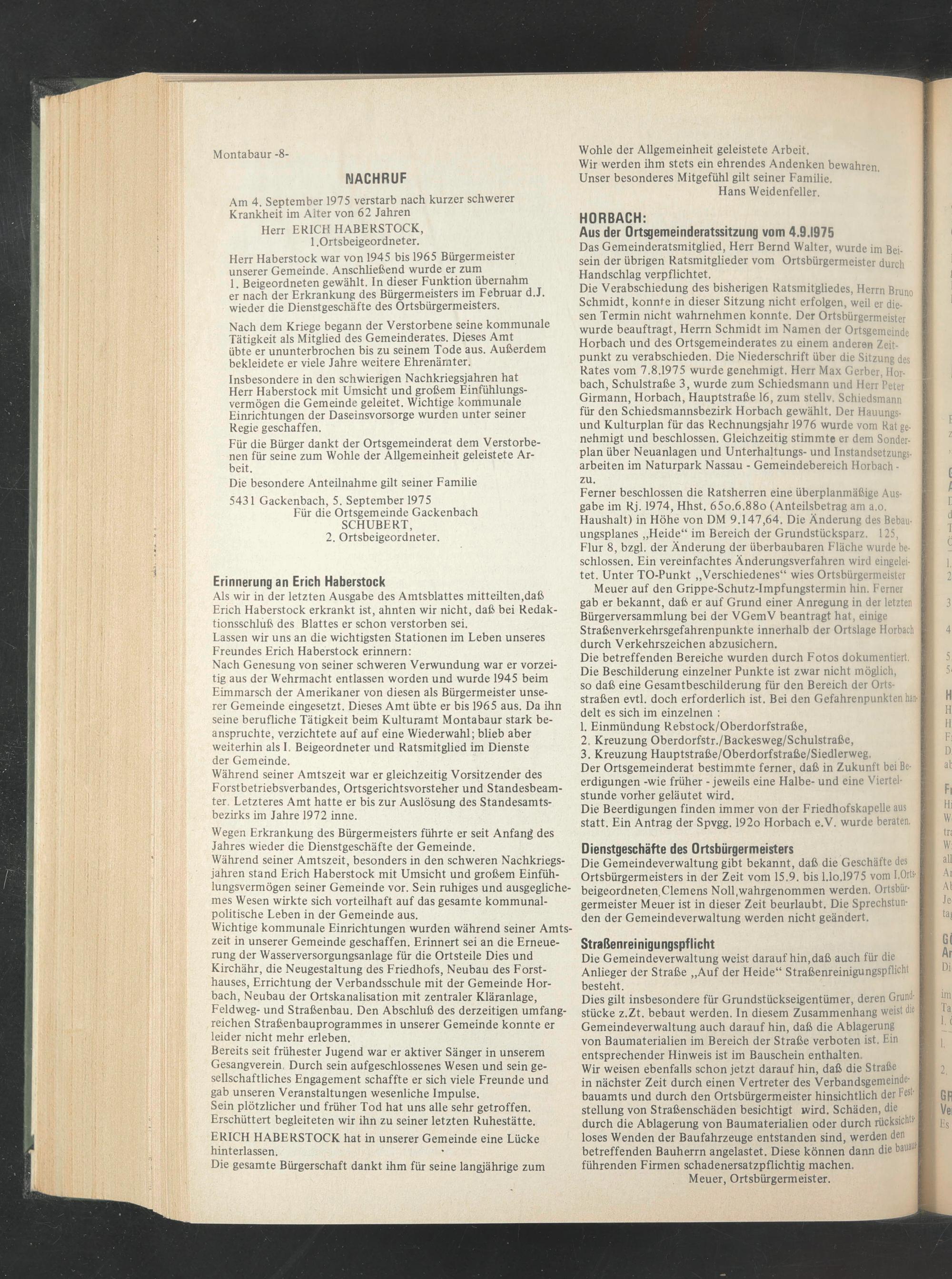 Die Verabschiedung des bisherigen Ratsmitgliedes, Herrn Bruno Schmidt, konnte in dieser Sitzung nicht erfolgen, weil er diesen Termin nicht wahrnehmen konnte. Der Ortsbürgermeister wurde beauftragt, Herrn Schmidt im Namen der Ortsgemeinde Horbach und des Ortsgemeinderates zu einem anderen Zeitpunkt zu verabschieden. Die Niederschrift über die Sitzung des Rates vom 7.8.1975 wurde genehmigt. Herr Max Gerber, Horbach, Schulstraße 3, wurde zum Schiedsmann und Herr Peter Girmann, Horbach, Hauptstraße 16, zum stellv. Schiedsmann für den Schiedsmannsbezirk Horbach gewählt. Der Hauungsund Kulturplan für das Rechnungsjahr 1976 wurde vom Rat genehmigt und beschlossen. Gleichzeitig stimmte er dem Sonderplan über Neuanlagen und Unterhaltungs- und Instandsetzungsarbeiten im Naturpark Nassau - Gemeindebereich Horbach - zu.