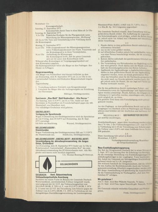 Wegen Verhinderung des Ortsbürgermeisters wird die Sprechstunde von Freitag, dem 19.9.1975 auf Donnerstag, den 18. Sept.