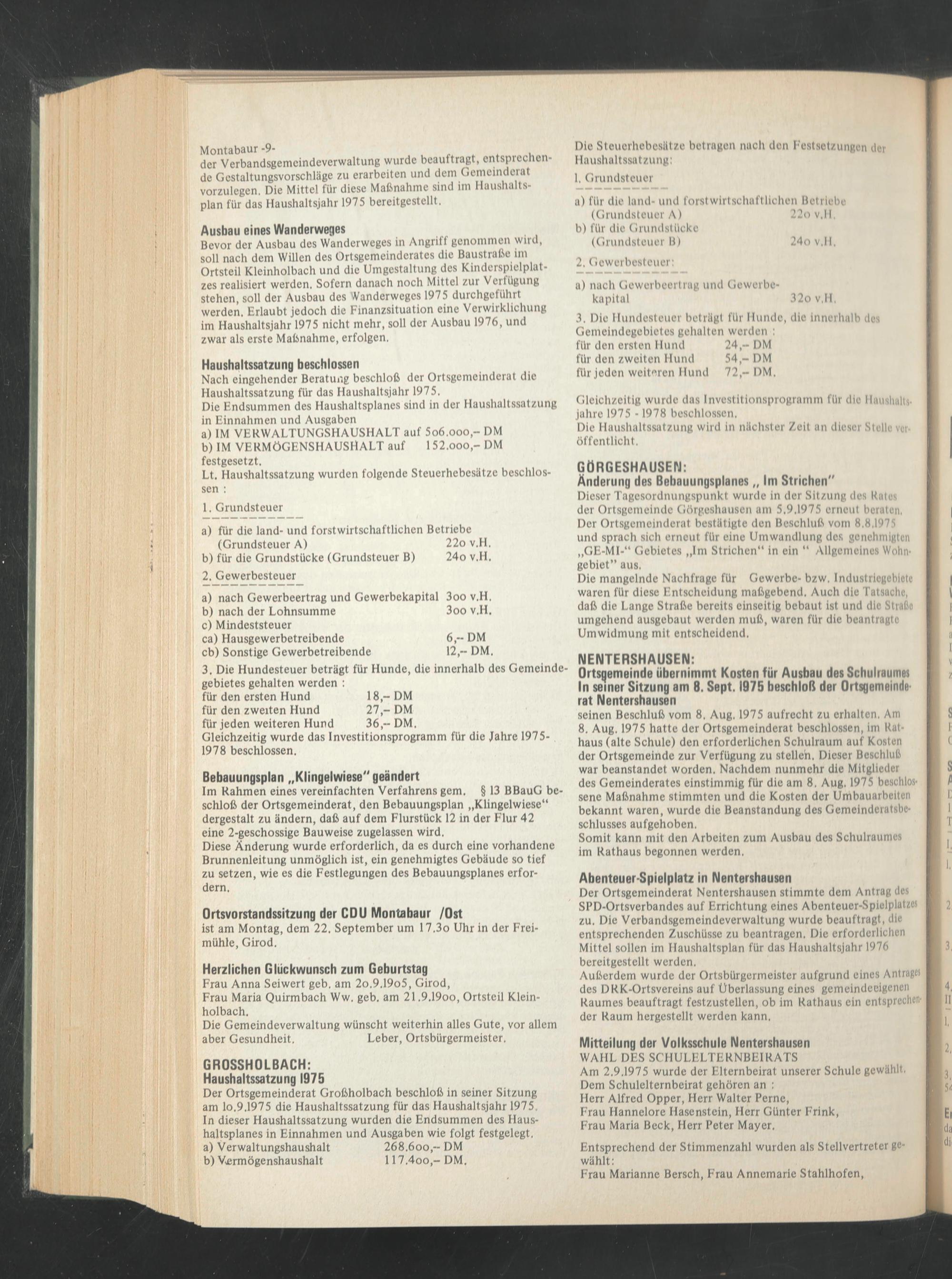 Der Ortsgemeinderat Großholbach beschloß in seiner Sitzung am lo.9.1975 die Haushaltssatzung für das Haushaltsjahr 1975,
