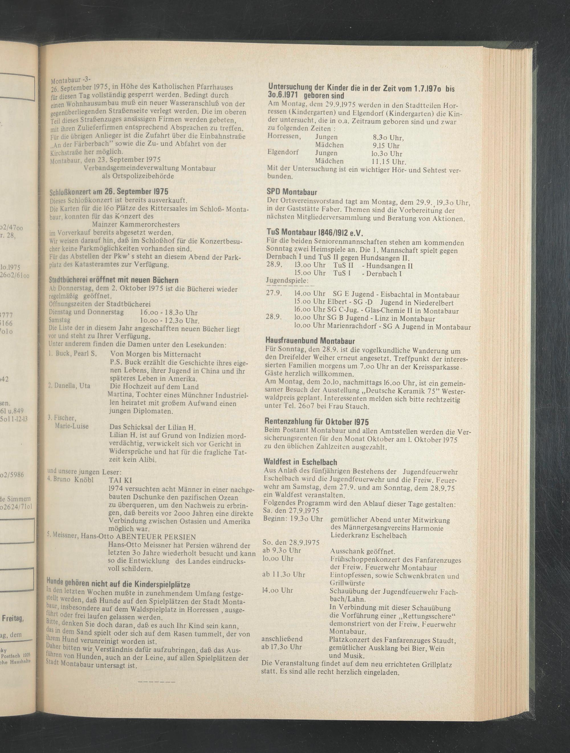Ab Donnerstag, dem 2. Oktober 1975 ist die Bücherei wieder regelmäßig geöffnet.