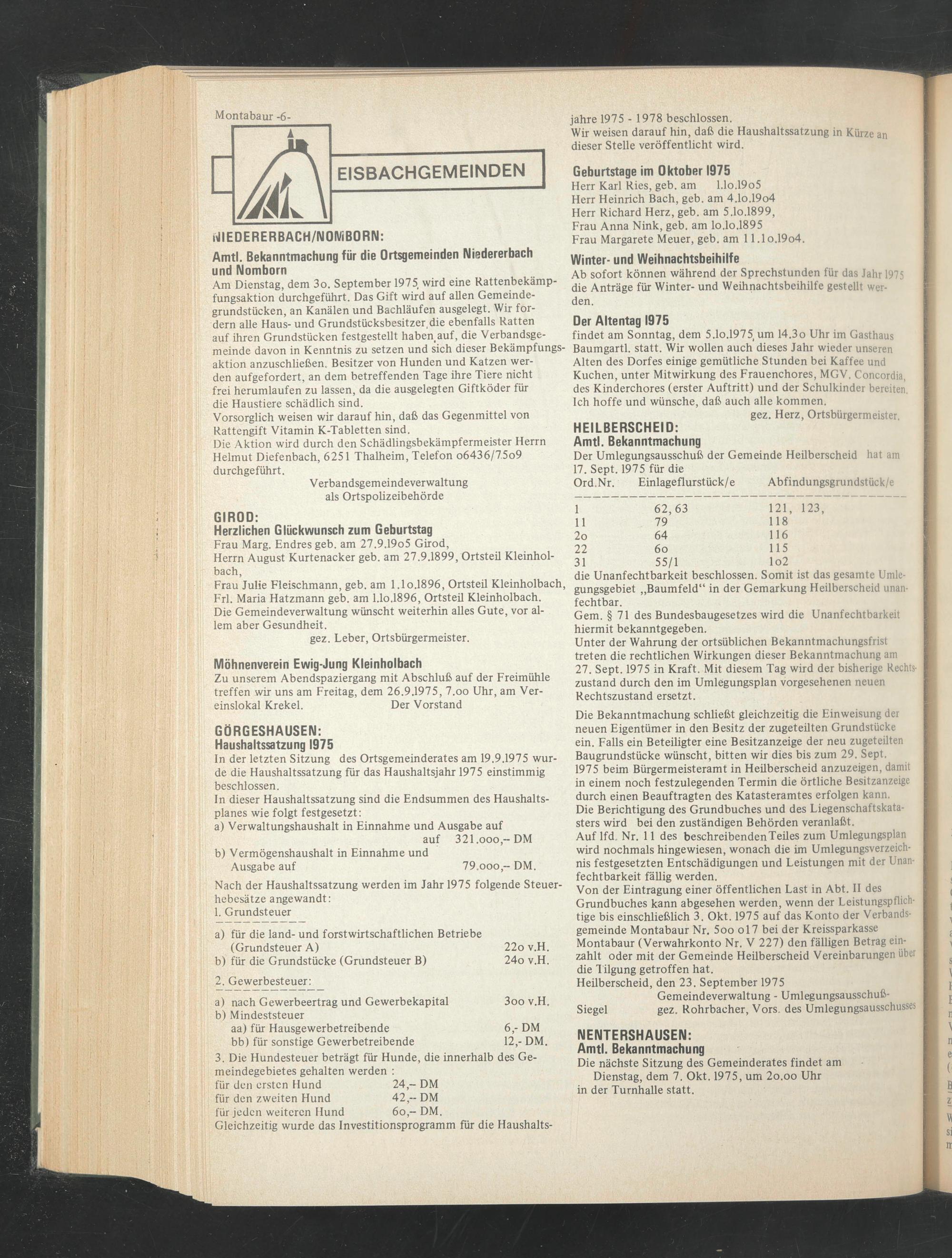 In der letzten Sitzung des Ortsgemeinderates am 19.9.1975 wurde die Haushaltssatzung für das Haushaltsjahr 1975 einstimmig beschlossen.