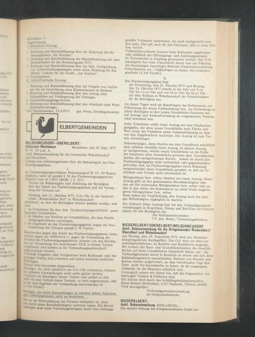 Am Montag, dem 29. September 1975 wird eine Rattenbekämpfungsaktion durchgeführt. Das Gift wird auf allen Gemeindegrundstücken, an Kanälen und Bachläufen ausgelegt. Wir fordern alle Haus- und Grundstücksbesitzer die ebenfalls Ratten auf ihren Grundstücken festgestellt haben, auf , die Verbandsgemeinde davon in Kenntnis zu setzen und sich diese Bekämpfungsaktion anzuschließen. Besitzer von Hunden und Katzen werden aufgefordert, an dem betreffenden Tage ihre Tiere nicht frei herumlaufen zu lassen, da die ausgelegten Giftköder für die Haustiere schädlich sind.