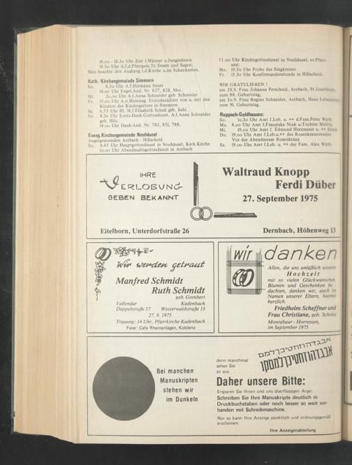 So. lo.3o Uhr Amt f.Leb. u. ++ d.Fam.Peter Wirth Mo. 8.oo Uhr Amt f.Franziska Nink u.Tochter Melitta Mi. 19.oo Uhr Amt f. Edmund Herzmann u. ++ Eltern Do. 19.oo Uhr Amt f.Leb.u.++ des Rosenkranzvereins Vor der Abendmesse Rosenkranz Sa. 19.oo Uhr Amt f.Leb. u. ++ der Farn. Alex Wirth