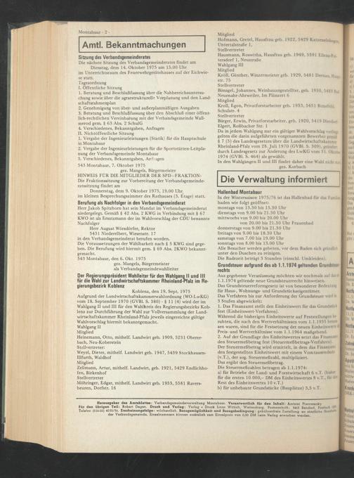 Die nächste Sitzung des Verbandsgemeinderates findet am Dienstag, dem 14. Oktober 1975 um 15.00 Uhr im Unterrichtsraum des Feuerwehrgerätehauses auf der Eichwie- se statt.