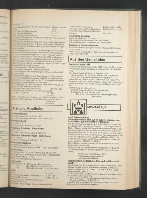 Ind der Zeit von Donnerstag, dem 9. Okrober bis Freitag, dem 17. Oktober 1975 werden im Zuge der L 326 (Engpaß Großer Markt - Kleiner Markt) in Montabaur Gerüstbauarbeiten an der Hausfront Bollentin durchgeführt. Während dieser Zeit ist die Baustellendurchfahrt auf 30 km/h beschränkt sowie mit einem Überholverbot versehen. In der Zeit der Fahrbahneinengung der L 326 im Engpaß zwischen „Großer und Kleiner Markt” ist die Lichtzeichenanlage am Fußgängerüberweg am Hause Grö- ninger auf gelbes Blinklicht geschaltet.