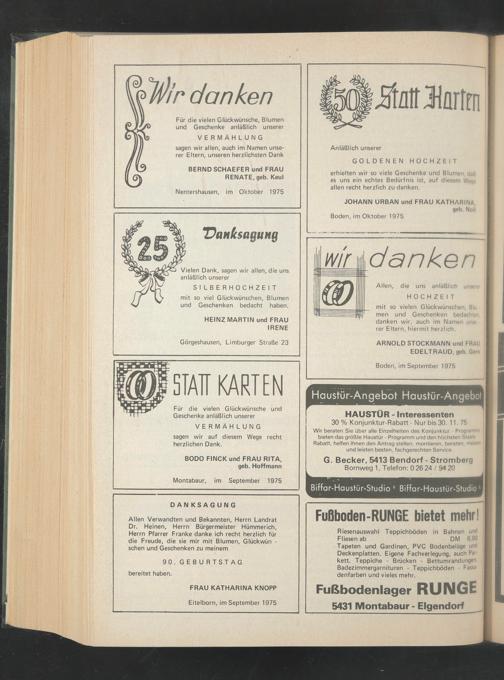 Allen Verwandten und Bekannten, Herrn Landrat Dr. Heinen, Herrn Bürgermeister Hümmerich, Herrn Pfarrer Franke danke ich recht herzlich für die Freude, die sie mir mit Blumen, Glückwün - sehen und Geschenken zu meinem