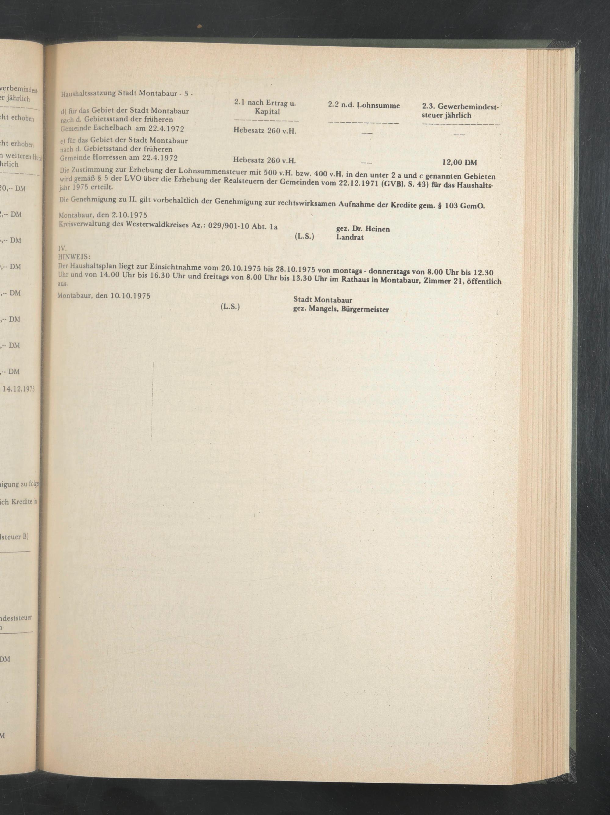 Der Haushaltsplan liegt zur Einsichtnahme vom 20.10.1975 bis 28.10.1975 von montags - donnerstags von 8.00 Uhr bis 12.30