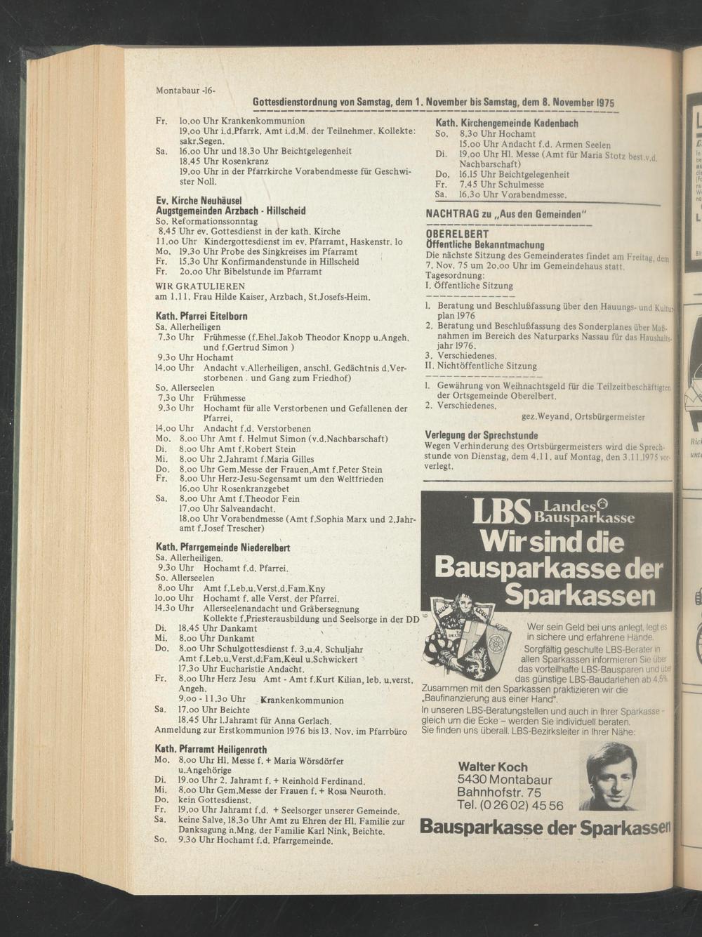 Wegen Verhinderung des Ortsbürgermeisters wird die Sprechstunde von Dienstag, dem 4.11. auf Montag, den 3.1 1.1975 vorverlegt.