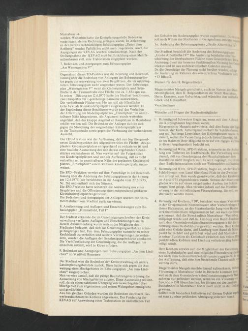 Die SPD—Fraktion verwies auf ihre Vorschläge in der Beschlußfassung über die Änderung des Bebauungsplanes in der Sitzung am 12.6.1975 (wir berichteten in der Ausgabe vom 27.6.1975,