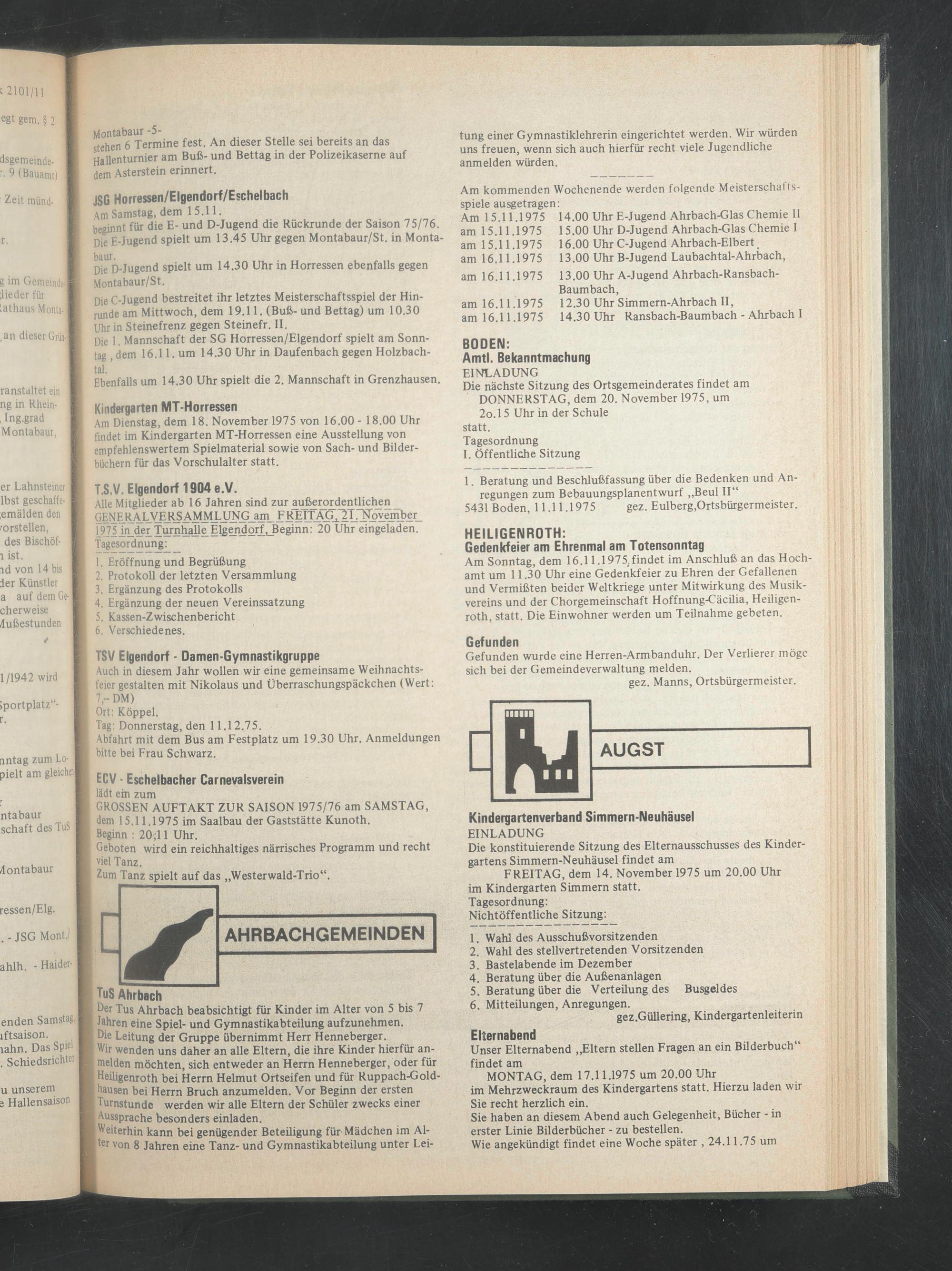 Am Sonntag, dem 16.11.1975.findet im Anschluß an das Hochamt um 11.30 Uhr eine Gedenkfeier zu Ehren der Gefallenen und Vermißten beider Weltkriege unter Mitwirkung des Musikvereins und der Chorgemeinschaft Hoffnung-Cäcilia, Heiligenroth, statt. Die Einwohner werden um Teilnahme gebeten.
