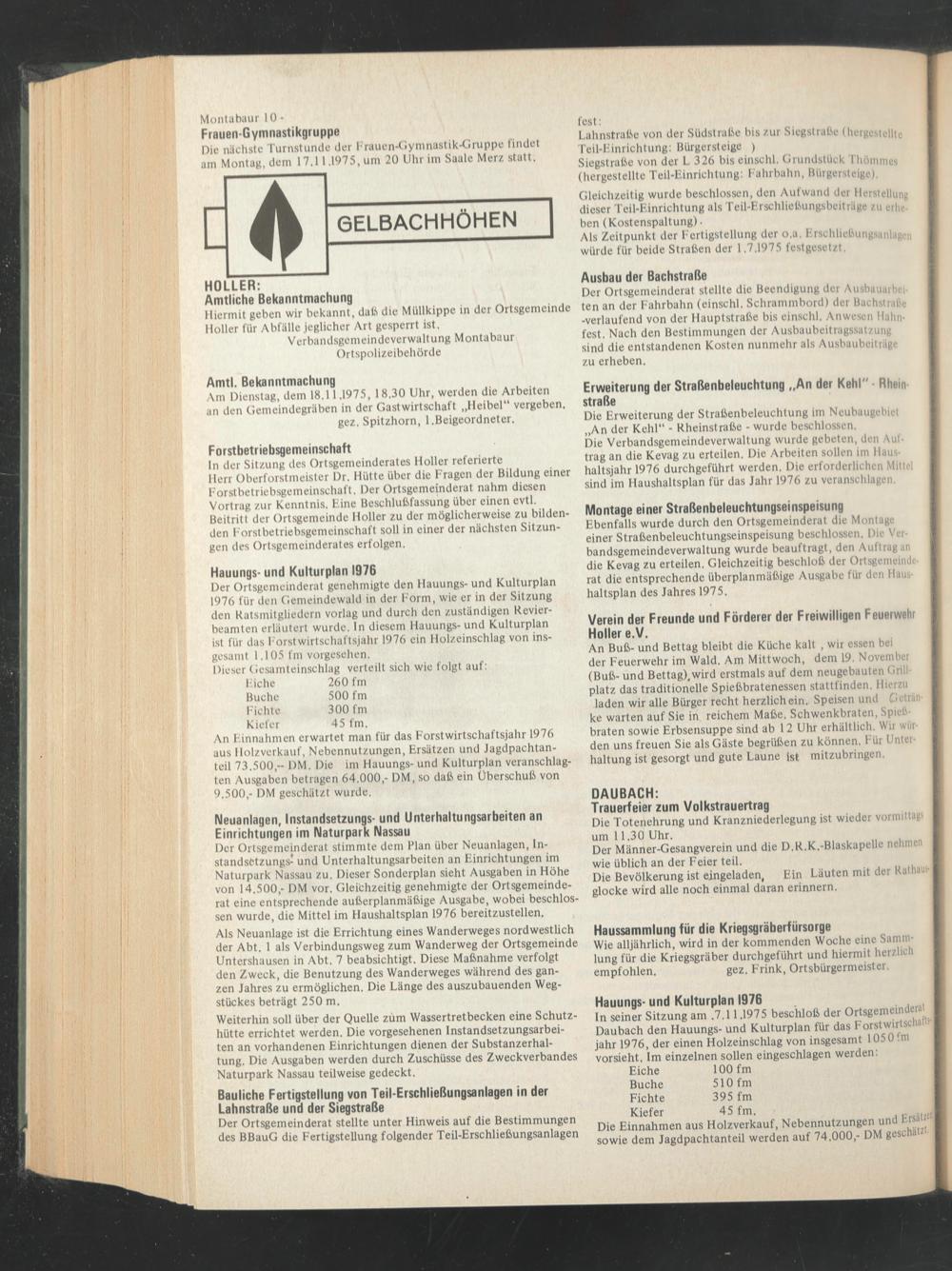 In seiner Sitzung am .7.11.1975 beschloß der Ortsgemeinderat Daubach den Hauungs- und Kulturplan für das Forstwirtschafts-j jahr 1976, der einen Holzeinschlag von insgesamt 1050 fm vorsieht. Im einzelnen sollen eingeschlagen werden: