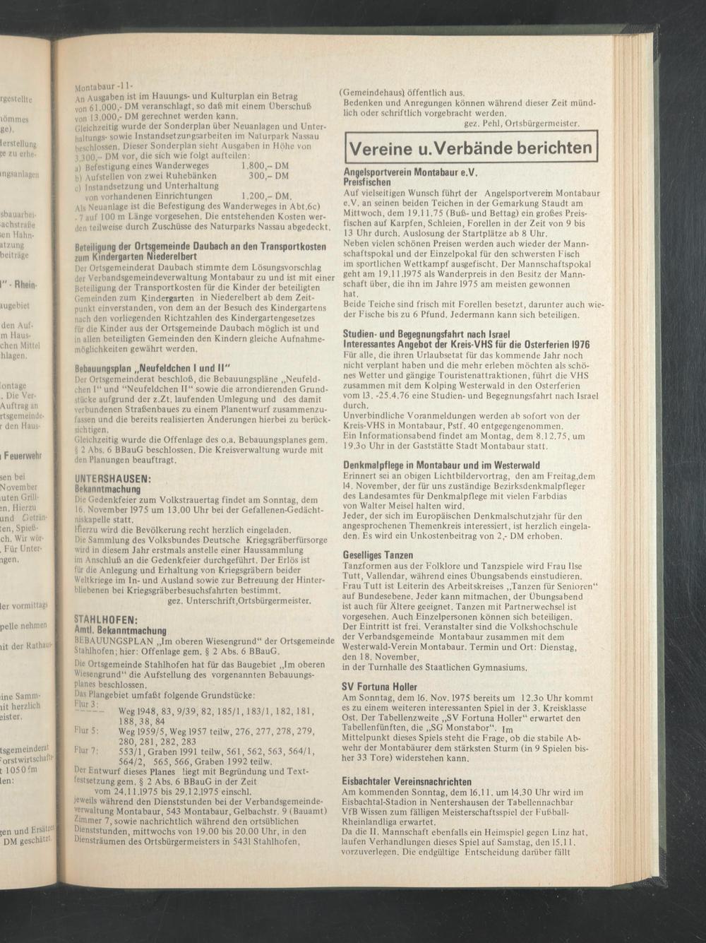 Auf vielseitigen Wunsch führt der Angelsportverem Montabaur e.V. an seinen beiden Teichen in der Gemarkung Staudt am Mittwoch, dem 19.11.75 (Buß- und Bettag) ein großes Preisfischen auf Karpfen, Schleien, Forellen in der Zeit von 9 bis 13 Uhr durch. Auslosung der Startplätze ab 8 Uhr.