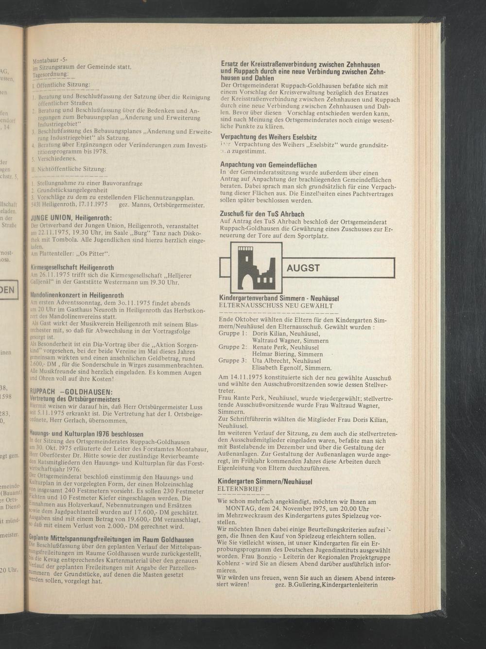 linder Sitzung des Ortsgemeinderates Ruppach-Goldhausen |am 30. Okt. 1975 erläuterte der Leiter des Forstamtes Montabaur, «Herr Oberförster Dr. Hütte sowie der zuständige Revierbeamte Iden Ratsmitgliedern den Hauungs- und Kulturplan für das Forst- [wirtschaftsjahr 1976.