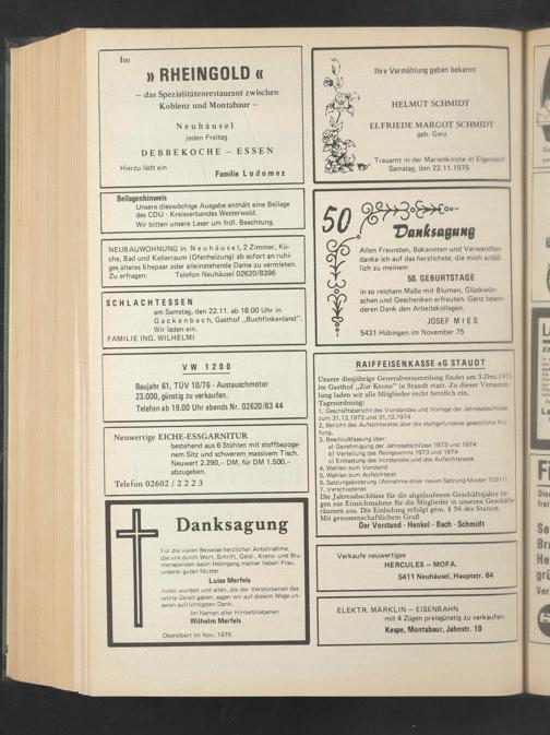 Unsere diesjährige Generalversammlung findet am 3.Dez.1975 im Gasthof „Zur Krone” in Staudt statt. Zu dieser Versammlung laden wir alle Mitglieder recht herzlich ein. Tagesordnung: